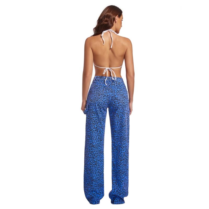 This pair of blue leopard print jeans is made of high-quality polyester fabric, which is soft and delicate to the touch and has excellent elasticity, ensuring comfort and freedom of movement when wearing. The low-rise straight-cut design is not only fashionable, but also fits the leg shape perfectly, suitable for women of all body types, exuding confident charm.